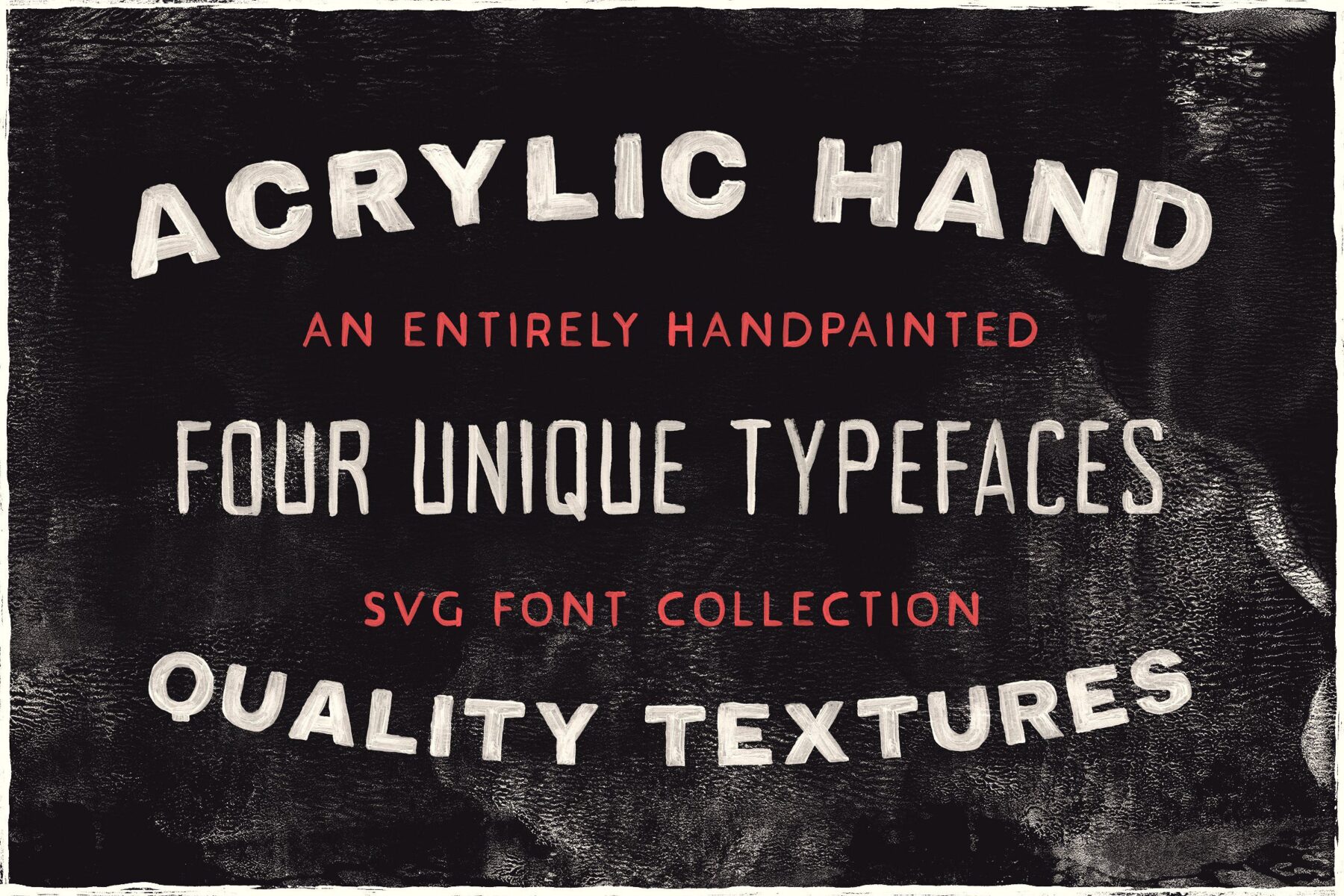 The Acrylic Hand Font Collection includes four SVG fonts with an entirely hand painted, multilingual glyph range featuring realistic and high-quality textures throughout. The textures are exactly as they appear with no extra work required!. What the heck are SVG Fonts?! SVG is an entirely new font format that functions similarly to standard fonts. The big difference is that this new format allows font designers to incorporate as much detail as we wish into our creations by using high-resolution bitmap images as opposed to vector. Please Note: Opentype SVG Fonts require Photoshop CC 2017 or Illustrator CC 2018 (or newer). TTF fonts are included and these work universally (they’re just not as cool looking). With new technology comes new questions, for which I am more than happy to help! Please do not hesitate to reach out.