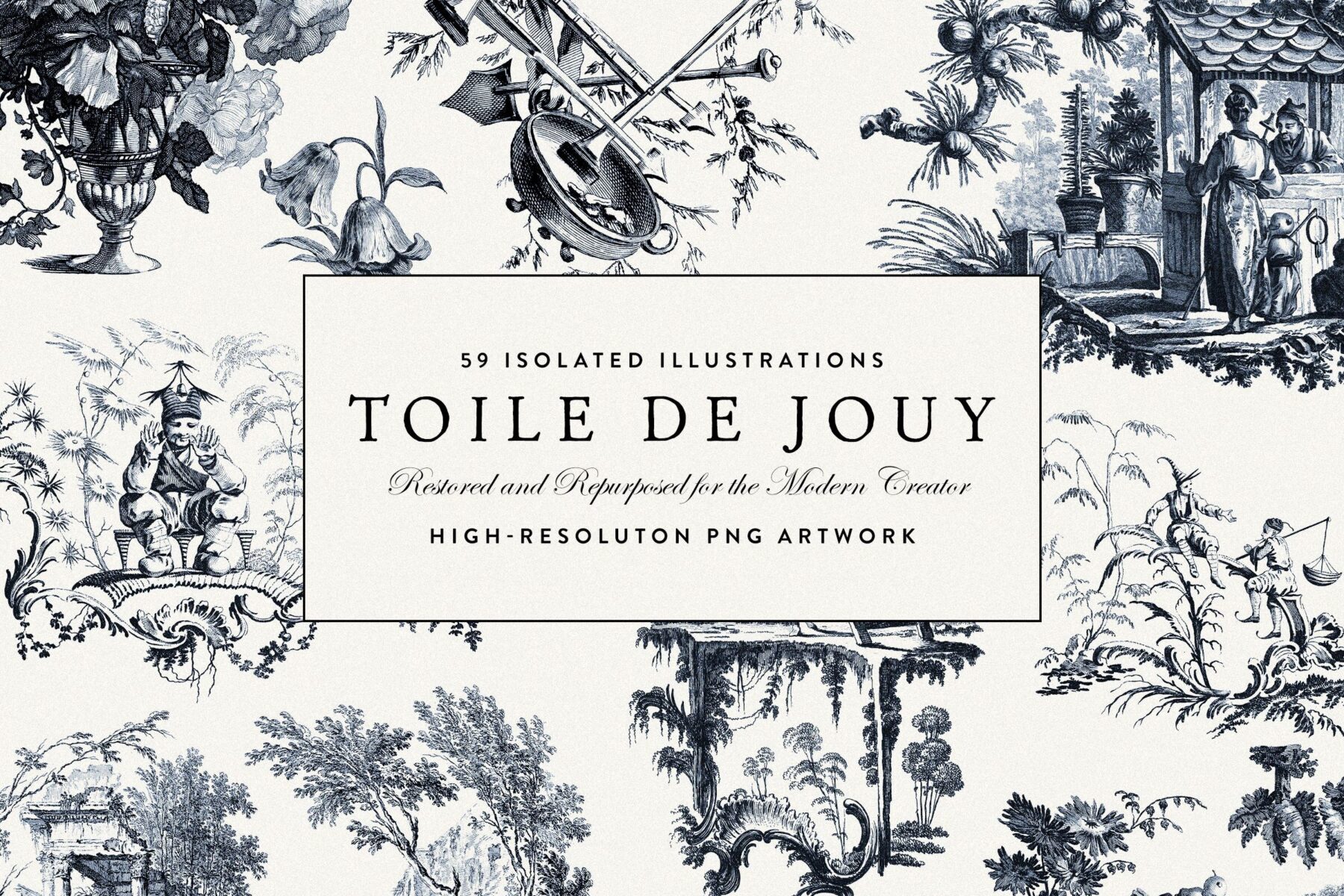 Discover Toile De Jouy’s gorgeous style within this meticulously edited collection of 59 isolated PNG illustrations. Inside, you’ll find three color choices for each illustration: Original Black, Blue, and my favorite, Blue-Ink! This final option has a subtle texture applied, making the illustration look like it has been printed with dark blue ink! It’s super effective and looks fantastic on light backgrounds.