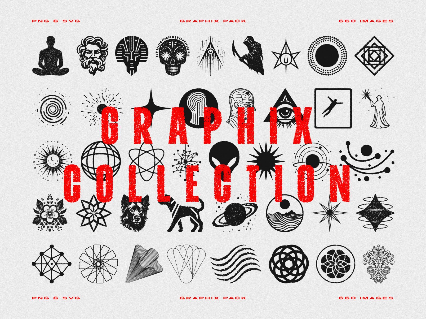 Introducing the Graphix Collection! Dive into a vast array of artistic graphics, perfect for elevating designs in posters, logos, apparel, and beyond. Each graphic, available in two distinct styles (drawn and textured – check out the second image for a glimpse), is provided in both versatile PNG and scalable SVG formats.