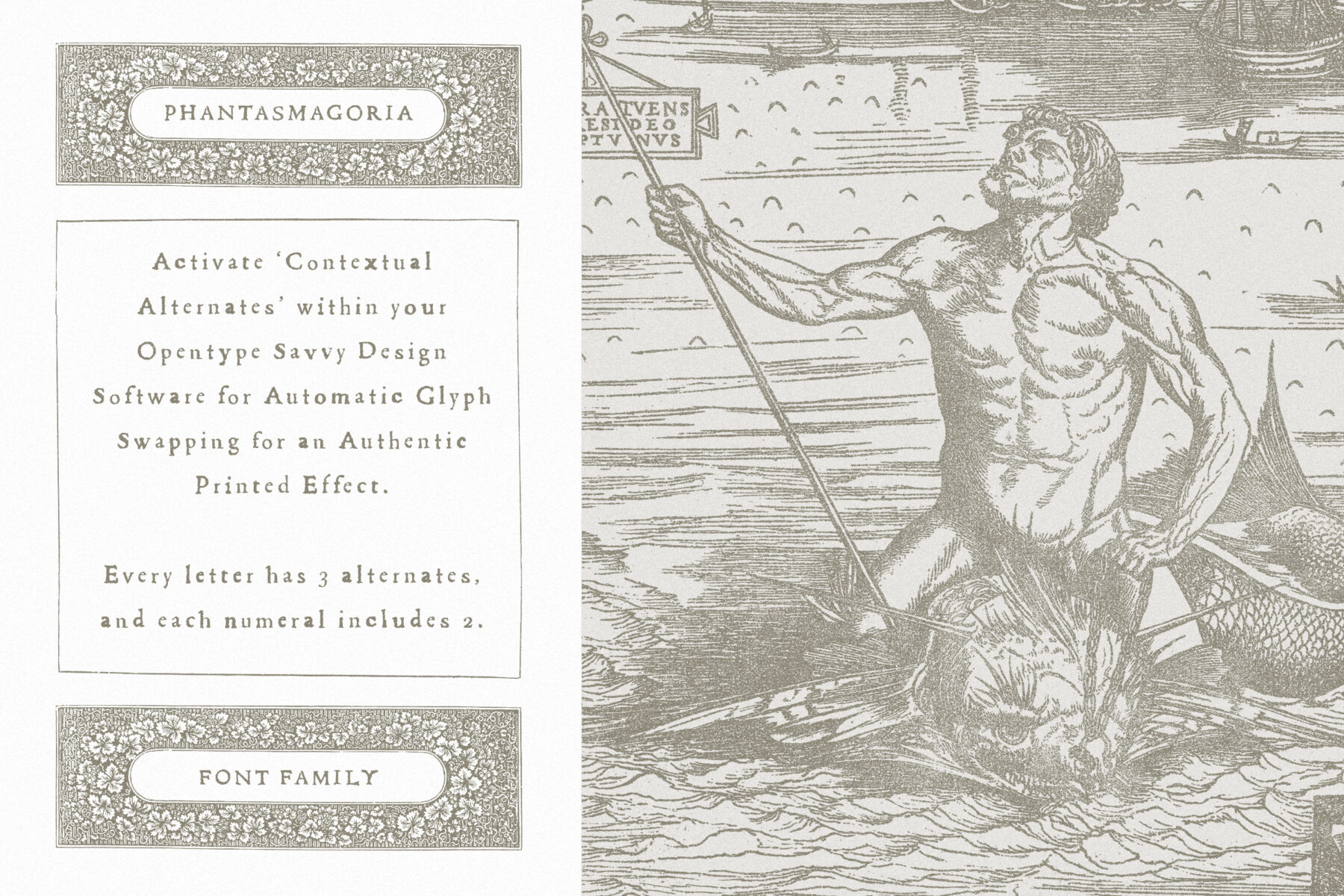 First printed back in 1648 and carefully brought back to life in 2025, Phantasmagoria is more than just a typeface – it’s history you can use. Every letter was lifted from genuine antique prints, restored with care, and adapted for modern design. To keep that authentic hand-pressed feel, each character comes with three alternates that swap automatically, so no two words ever look quite the same.