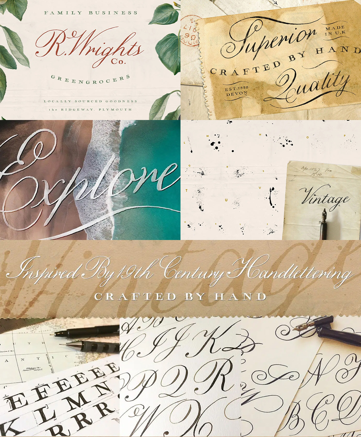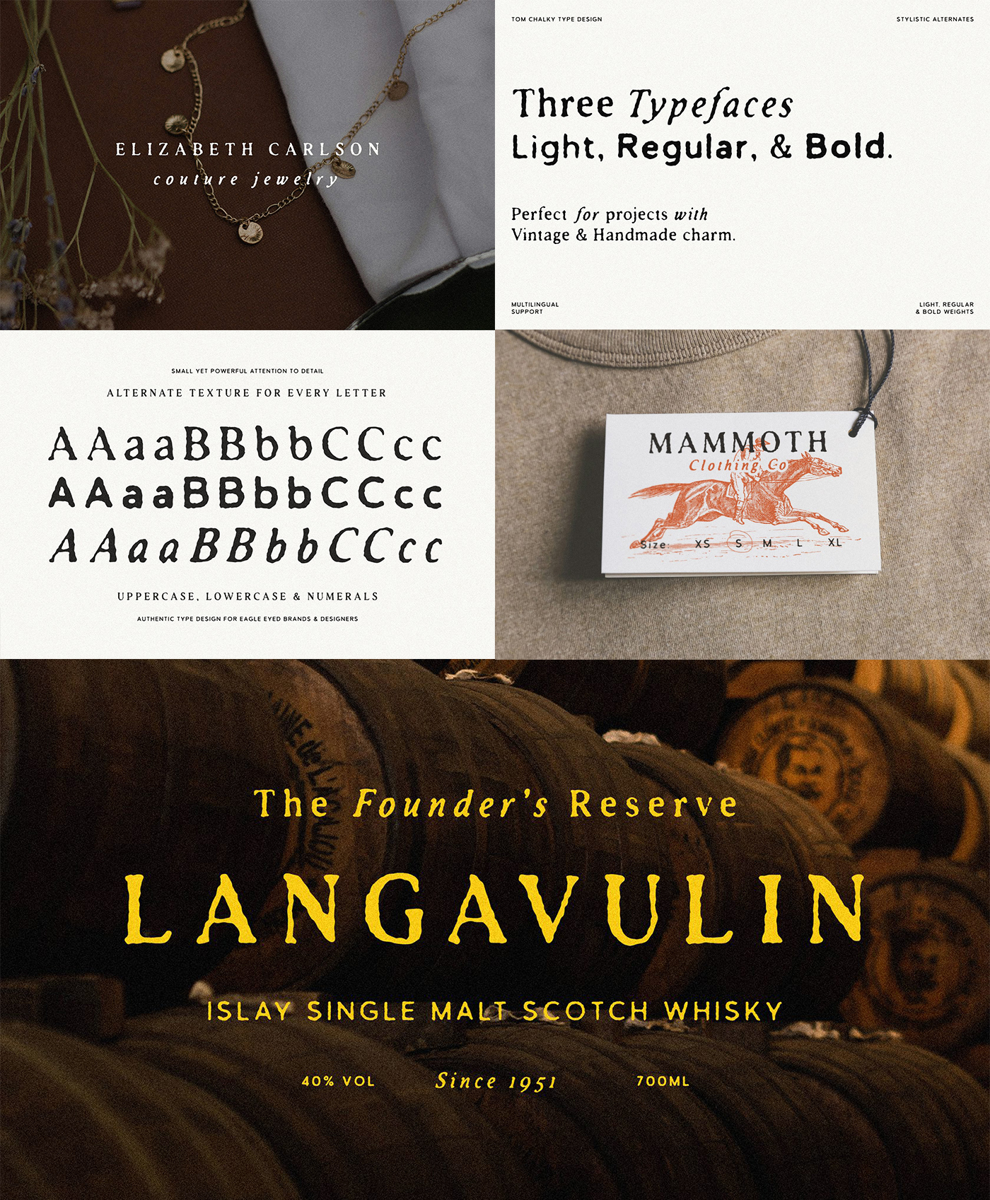 This collection is ideal for modern branding projects with a vintage twist, rustic wedding invitations and stationery, history-themed design projects, and editorial work! I especially enjoy using these fonts in smaller sizes with wide spacing as displayed throughout the presentation imagery.