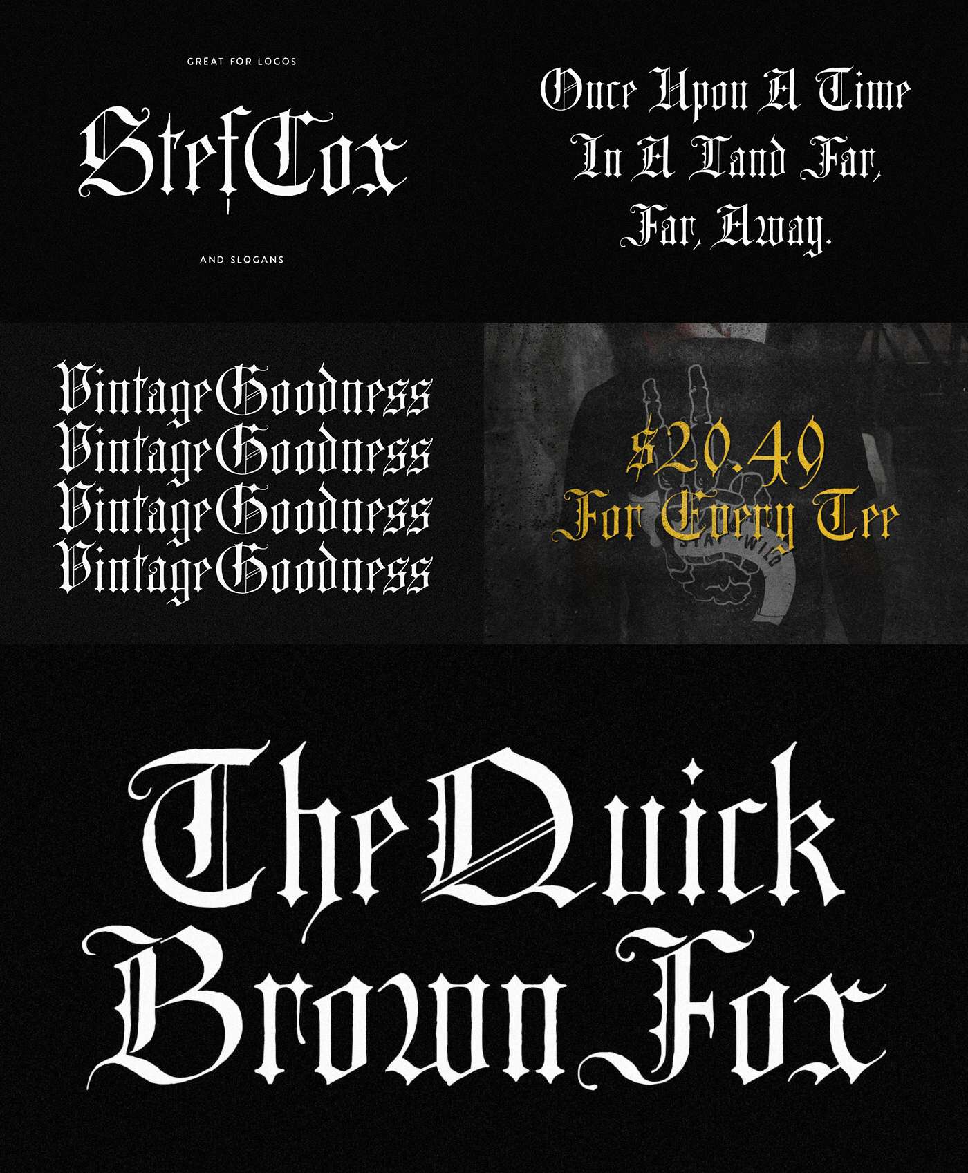 TC Grimstone draws from vintage blackletter specimens, bringing together those classic angular shapes with softer, rounded edges for a look that feels both old-world and fresh. It’s got a modern medieval vibe that works perfectly for anything from logos and branding to posters and album covers.