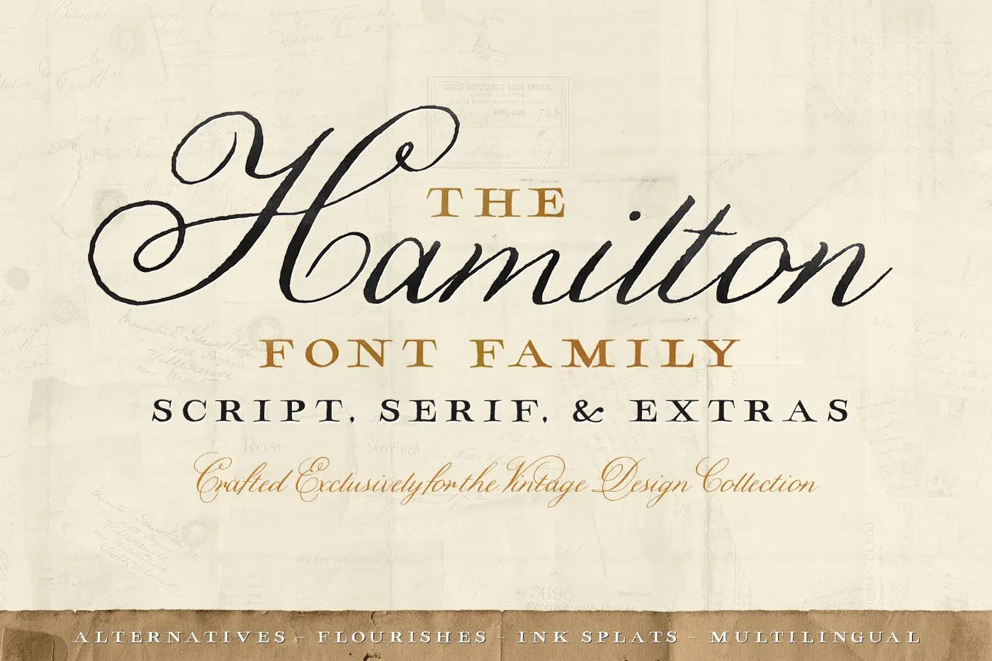TC Hamilton – Add an extra layer of 19th-century style to your design work with the original Hamilton Font family. Within this family you will find; A beautifully handcrafted script font loaded with a decorative set of stylistic alternatives and perfect imperfections, a vintage map inspired serif that looks great both on its own and when paired with its cursive partner, a set of detailed ink splats (available as a font and as vectors) to add even more creativity when using any of the Hamilton fonts, and last but not least a flourish font (also available as vectors) to help bring your work to life!
