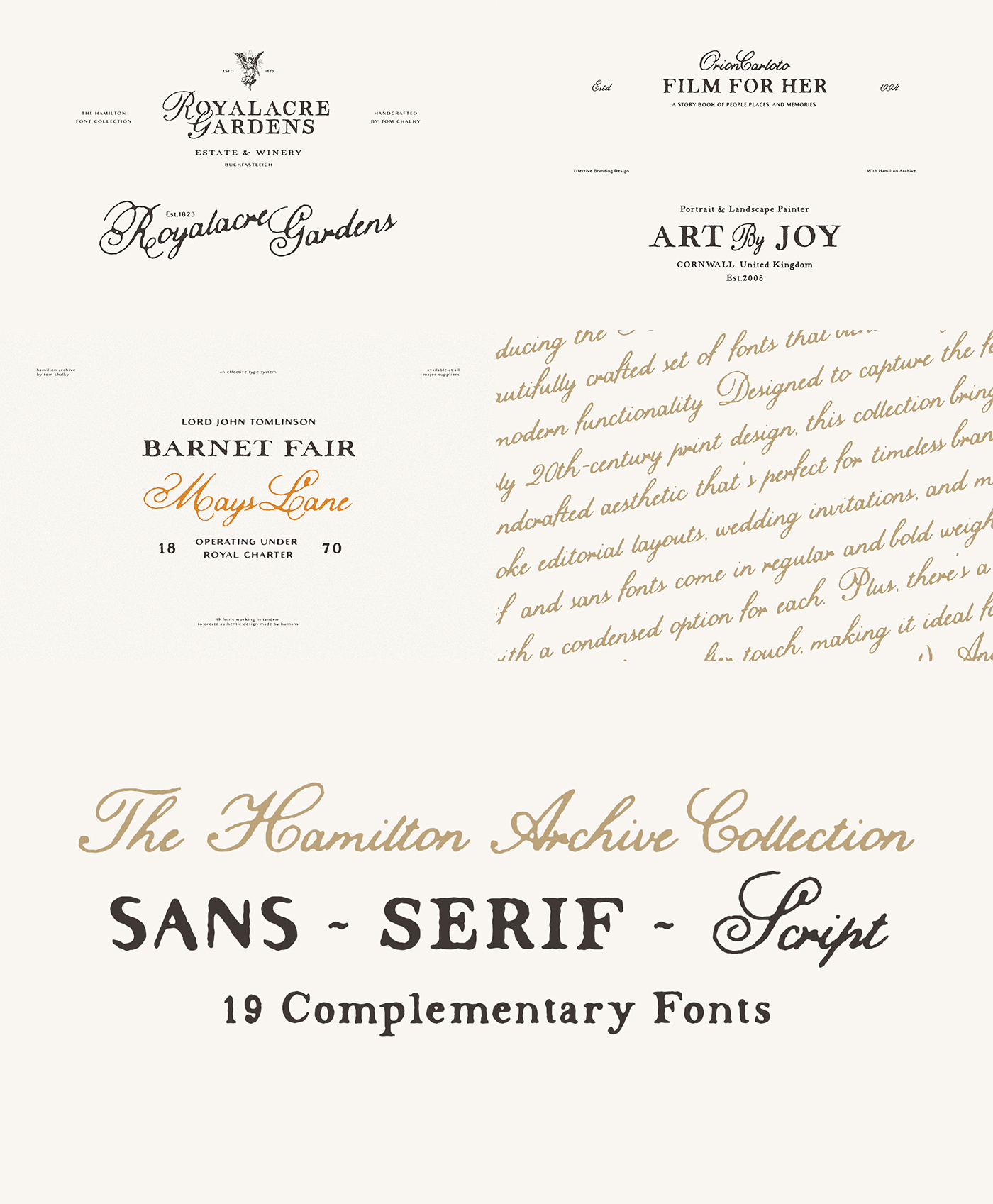 TC Hamilton Archive – a beautifully crafted set of fonts that blend vintage charm with modern functionality. Designed to capture the feel of early 20th-century print design, this collection brings a handcrafted aesthetic that’s perfect for timeless branding, bespoke editorial layouts, wedding invitations, and more.