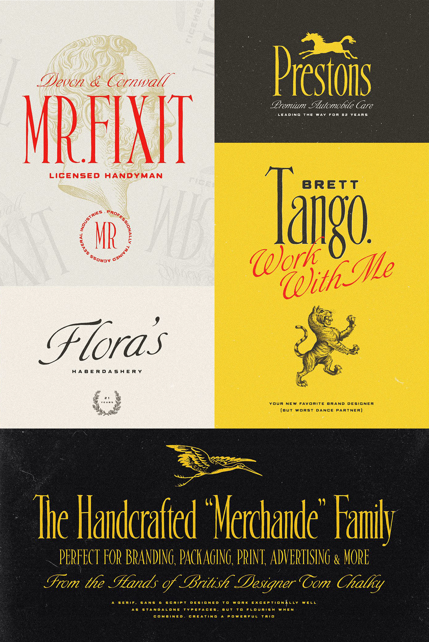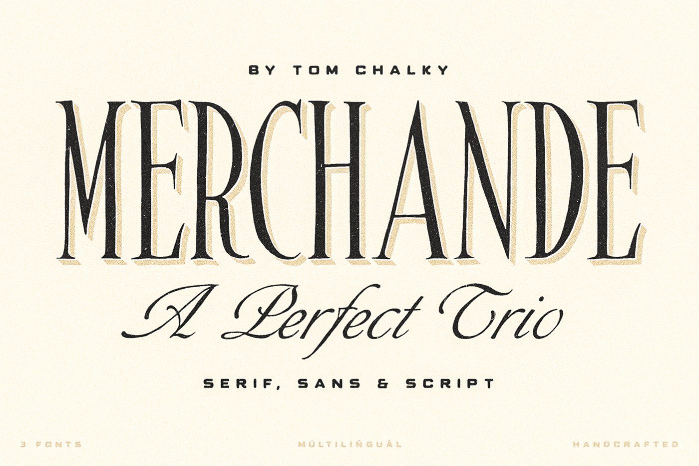 TC Merchande – a refined font trio inspired by mid-century typography, crafted to elevate your branding, packaging, and advertising designs. This versatile trio includes a sharp serif, a clean sans, and an elegant script, each designed to work beautifully alone or harmoniously together. From vintage-inspired packaging to sophisticated print layouts, Merchande offers the flexibility to bring a timeless, stylish flair to your projects; Perfect for designers seeking a balance of personality and precision.