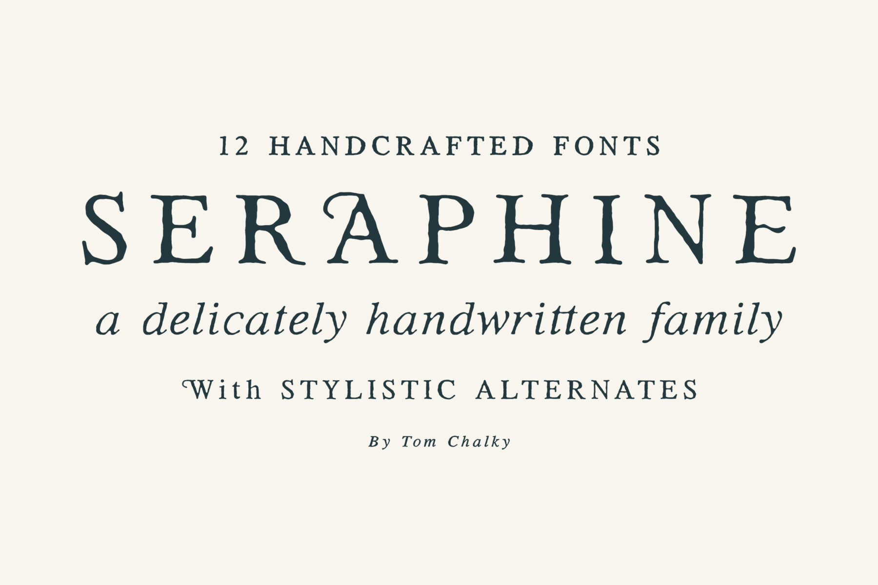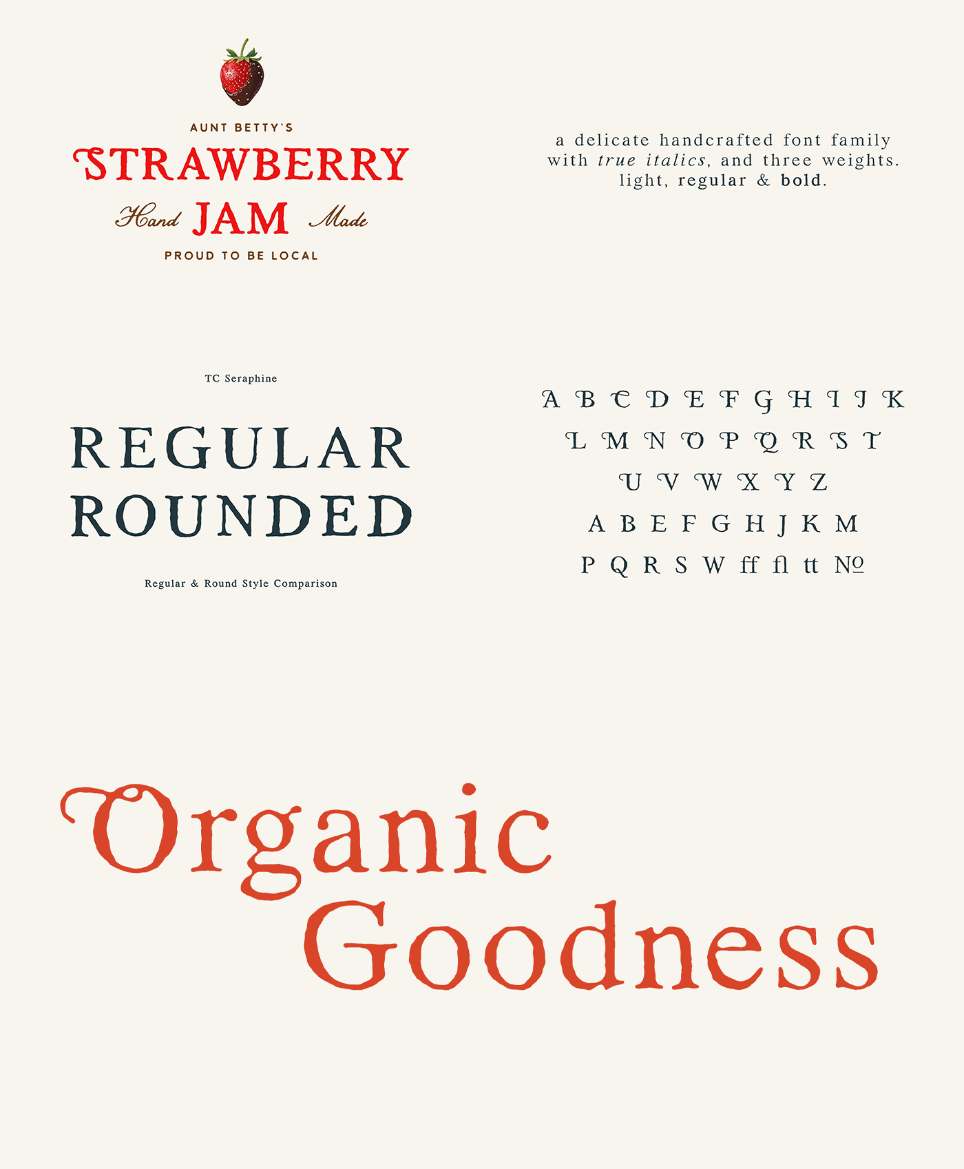 TC Seraphine blends classic serif structure with a hint of human warmth, giving each letter a subtle, organic feel. Whether you’re working on branding, editorial layouts, or packaging, this versatile family can adapt to a wide range of styles and projects!
